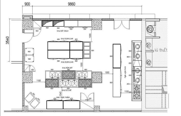 | Vệ sinh | Máy rửa bát, bồn rửa 3 hố, bẫy mỡ | Tách biệt hoàn toàn với khu vực ra hàng |