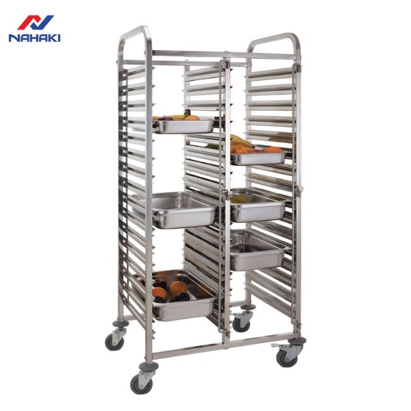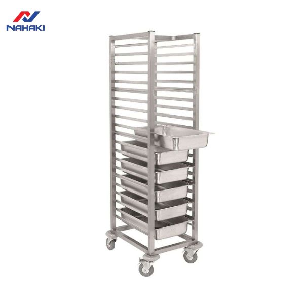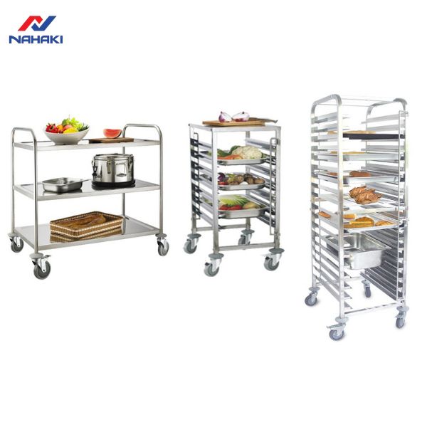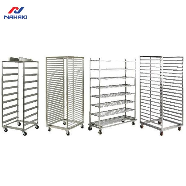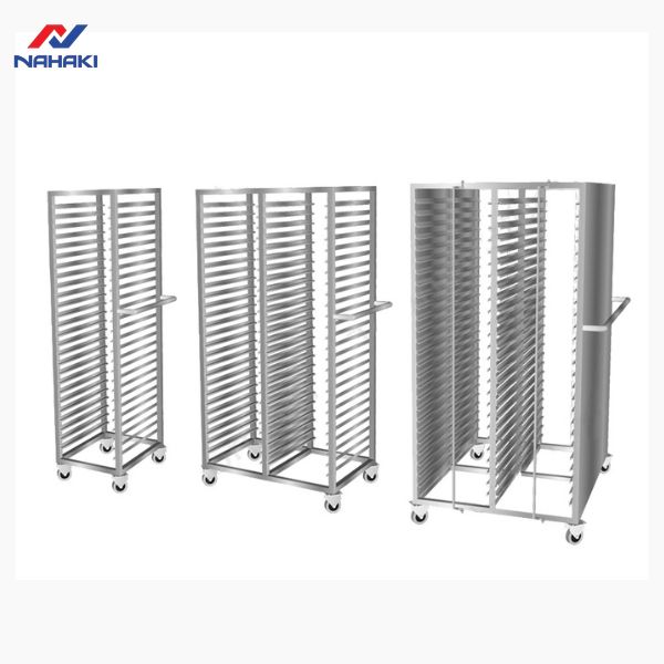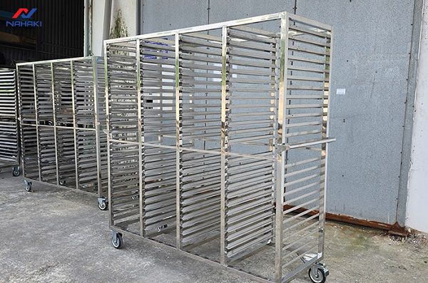 Bên cạnh xe đẩy khay cơm, Nahaki còn cung cấp các mẫu xe đẩy khay bánh với thiết kế đặc thù cho các lò nướng. Khoảng cách các tầng khay của loại xe này thường lớn hơn để phù hợp với độ nở của bánh, trong khi xe đẩy cơm lại tập trung vào mật độ khay dày để tối ưu diện tích. Sự đa dạng trong thiết kế giúp Nahaki đáp ứng mọi yêu cầu khắt khe nhất của khách hàng.